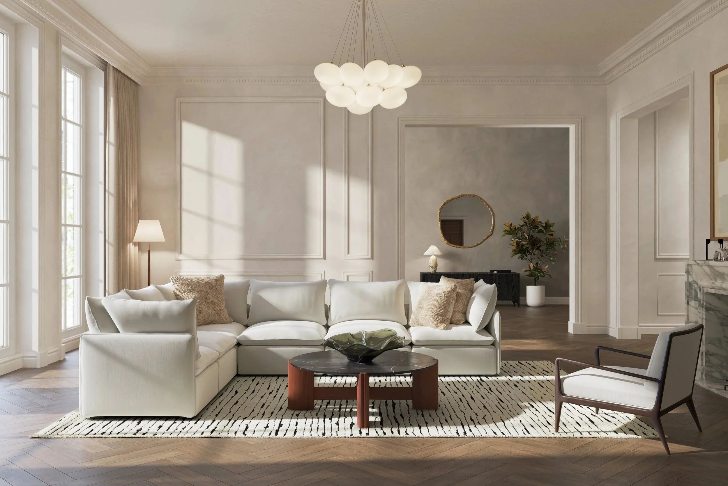 The marble fireplace serves as a material focal point, introducing texture and subtle contrast within an otherwise restrained palette.
