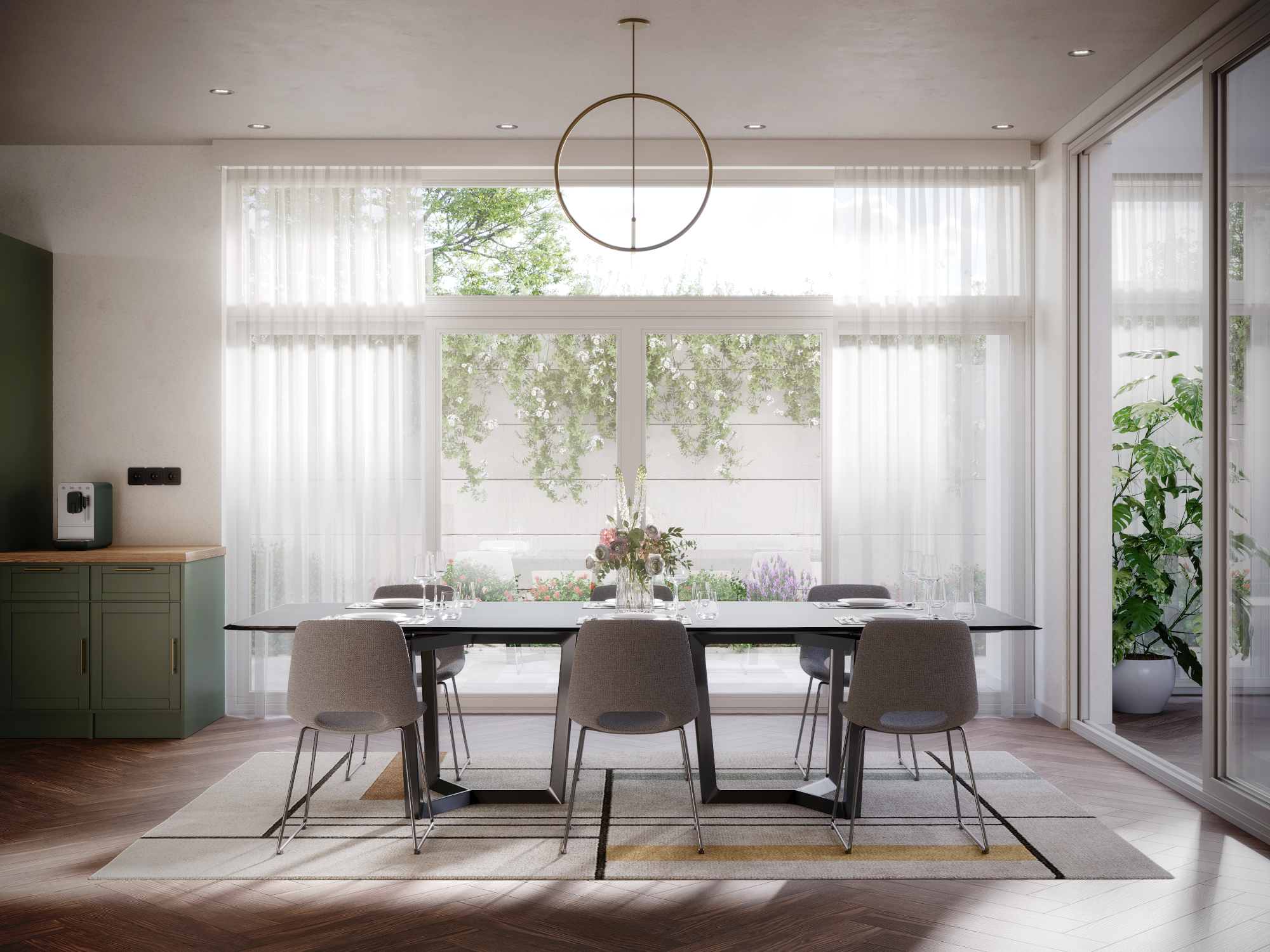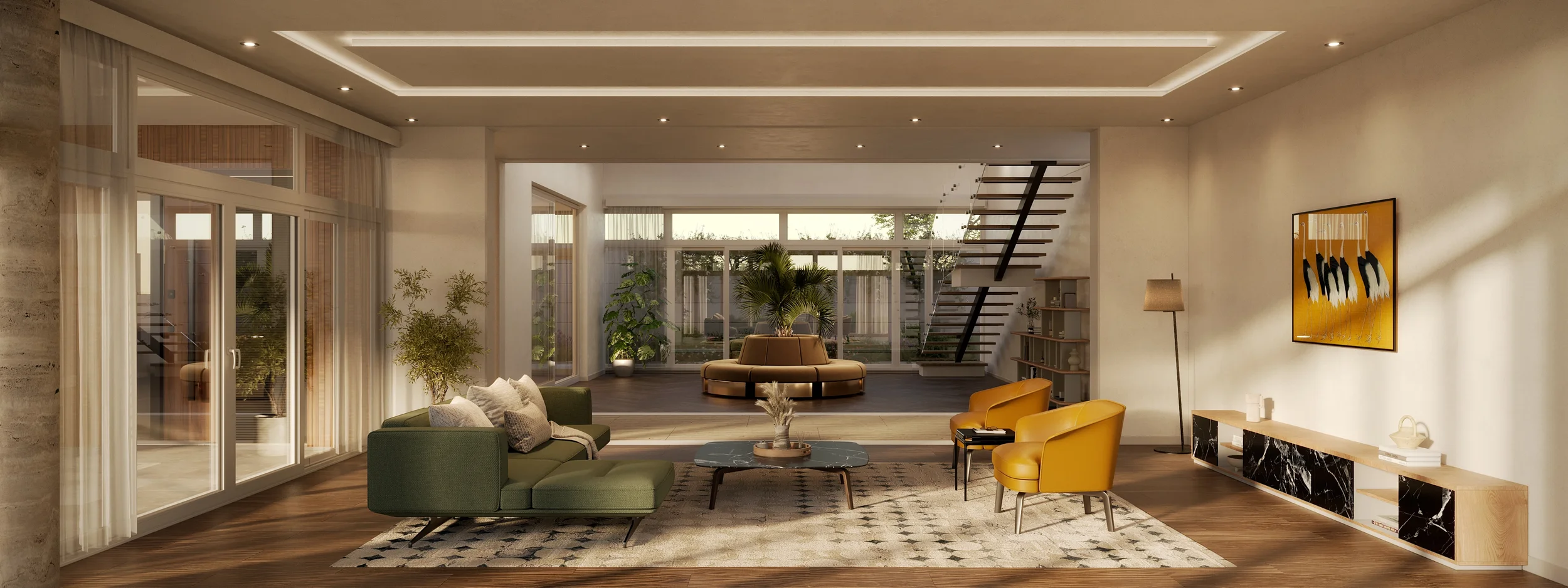 The interior was fully redesigned, including material selection, color palette, and furniture layout. The aim was to introduce a warmer, sunset-driven atmosphere that contrasts with the neutrality of the architectural shell.